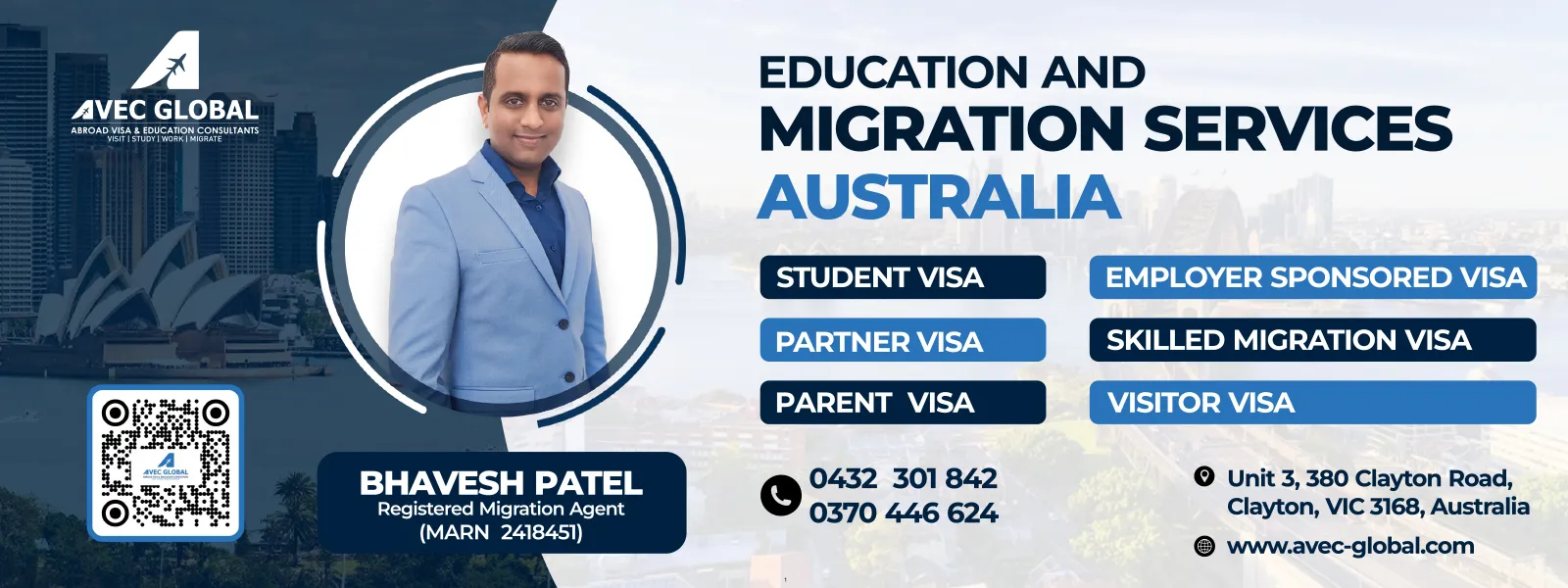 AVEC-GLOBAL is an Education and Migration Visa Services Company, with its head-office established in Melbourne, Australia in 2024 and there is an expert team of Registered Migration agents to handle different visa categories of Student Visa, General Skilled Migration Visa, Parents Visa, Partner Visa, Training Visa and Employer Sponsored Visa. We have made our reputation of being reliable and most transparent visa experts in Melbourne.