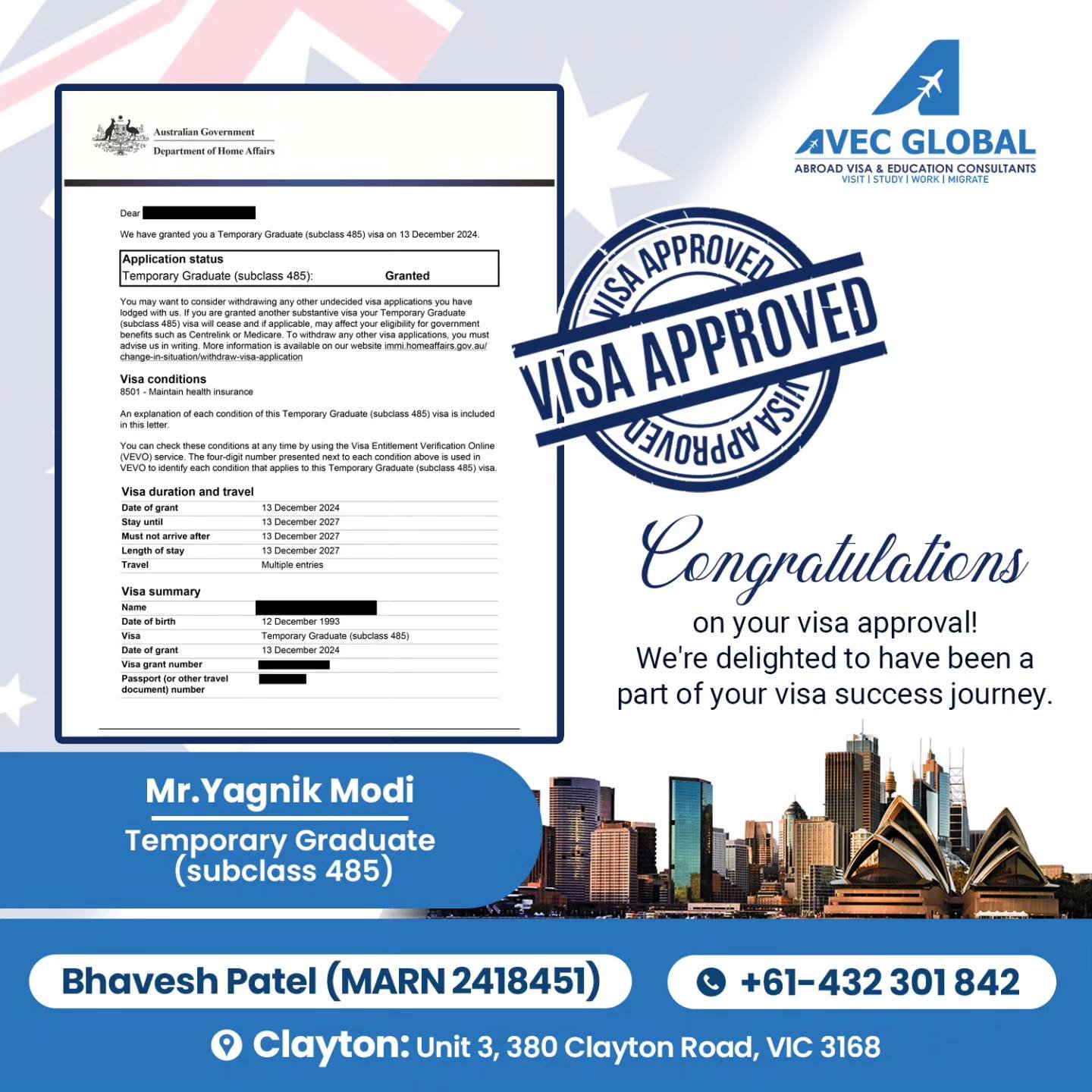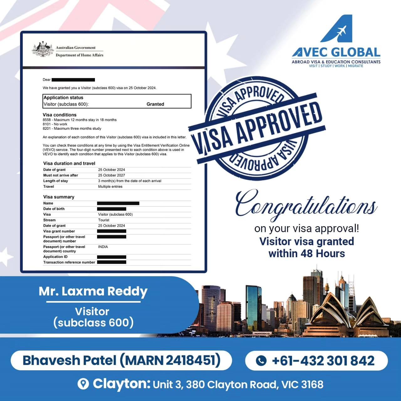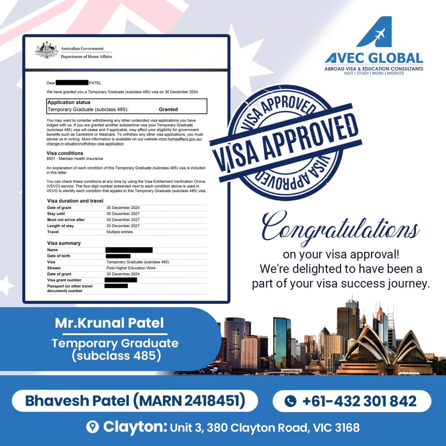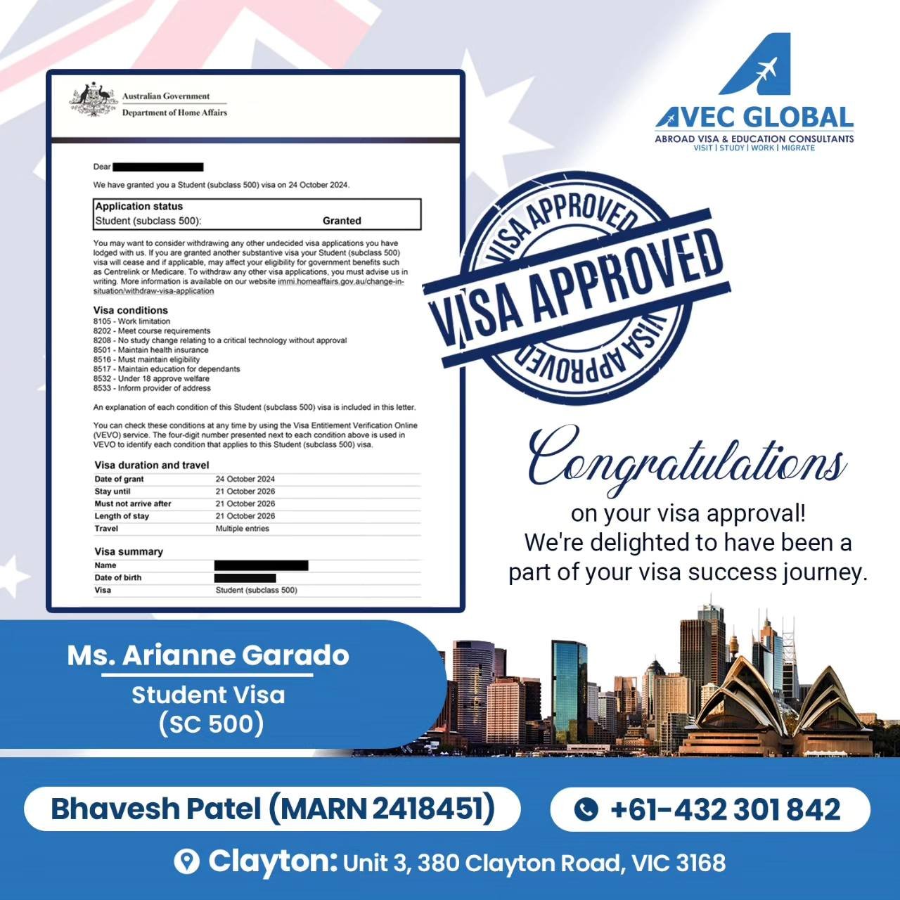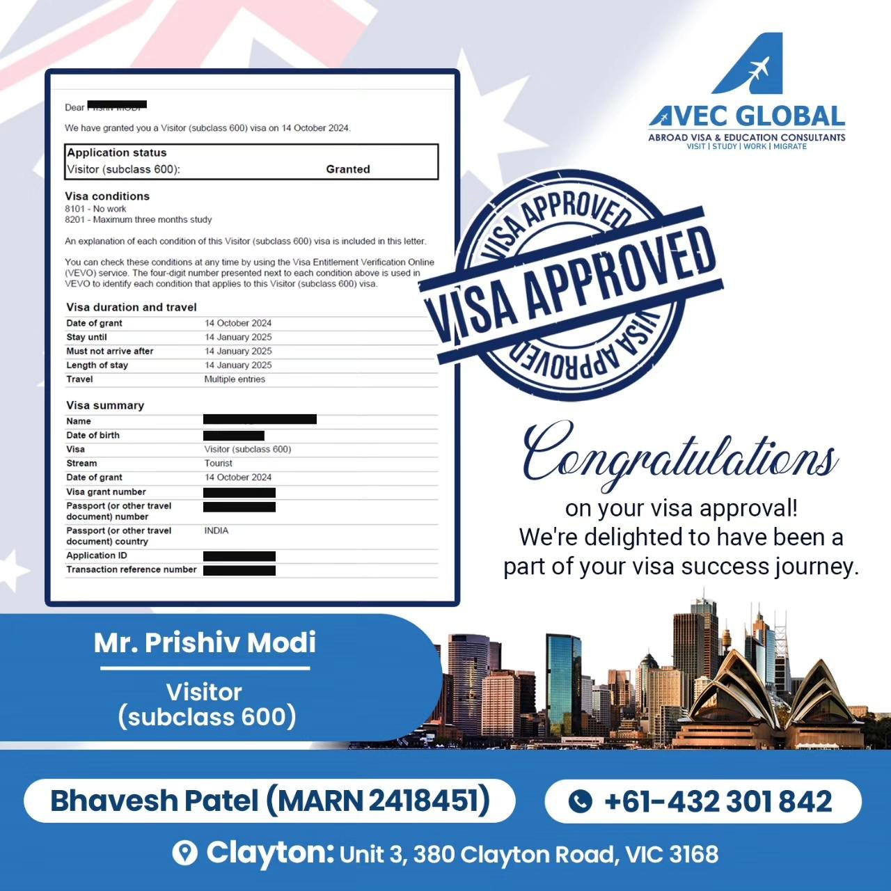 AVEC-GLOBAL is an Education and Migration Visa Services Company, with its head-office established in Melbourne, Australia in 2024 and there is an expert team of Registered Migration agents to handle different visa categories of Student Visa, General Skilled Migration Visa, Parents Visa, Partner Visa, Training Visa and Employer Sponsored Visa. We have made our reputation of being reliable and most transparent visa experts in Melbourne.